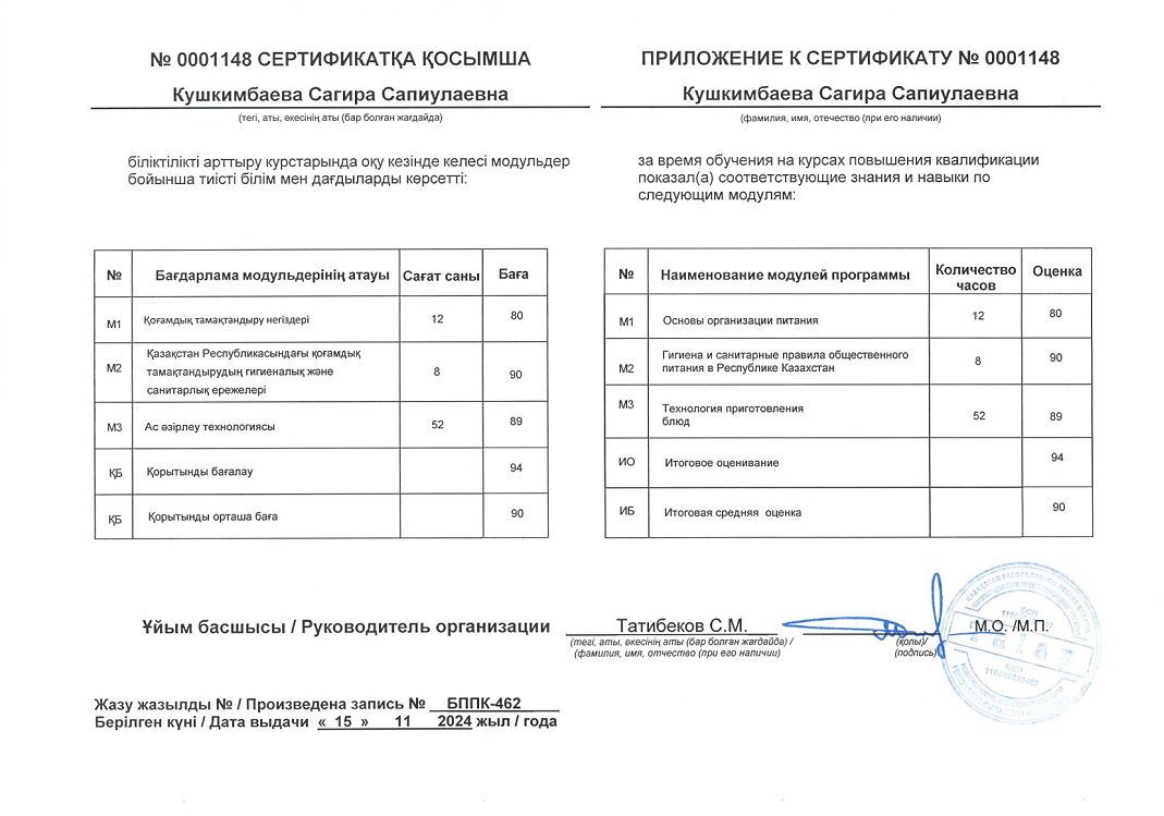 «Тамақтандыру саласындағы педагогтердің кәсіби құзіреттілігін арттыру» тақырыбы аясында өткізілген біліктілік арттыру курсына колледж арнайы пәні оқытушысы Кушкимбаева Сағира Сапиуллаевна қатысып сертификатын алды 04.11-15.11.2024 ж., 72 академиялық сағат