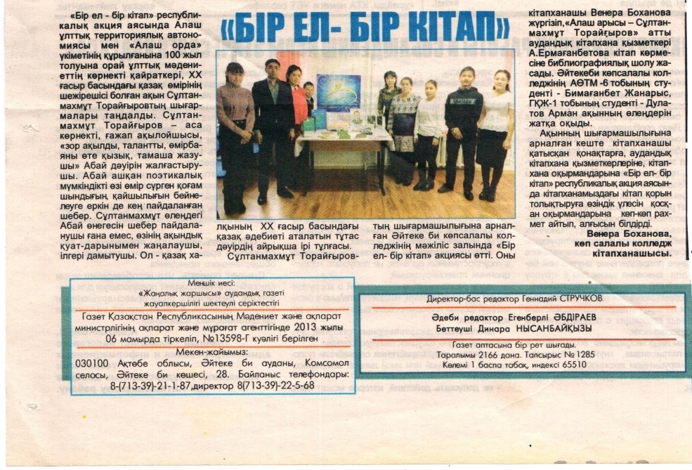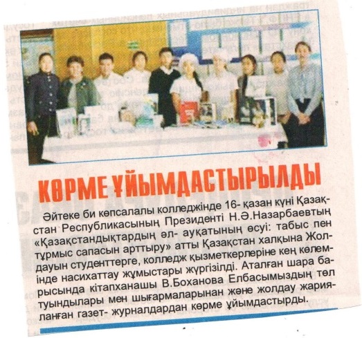 Ұйымдастырылған іс –шаралар жергілікті жаңалық жаршысы газетіне жарияланып тұрады. «Алуан ұлттың қазаққа алғысы шексіз» алғыс айту күніне орай, Бір ел бір кітап акциясы аясында «Алаш арысы–Сұлтанмахмұт Торайғыров» атты аудандық кітапхана қызметкері А.Ермағанбетова кітап көрмесіне библиографиялық шолу жасады. Қазақстан Республикасының Президенті Н.Назарбаевтың «Қазақстандықтардың әл-ауқатын өсіру: табыс пентұрмыс сапасын арттыру» атты Қазақстан халқына Жолдауы студенттерге, колледж қызметкерлеріне кең көлемінде насихаттау жұмыстары жүргізілді.