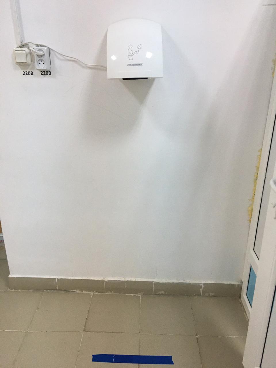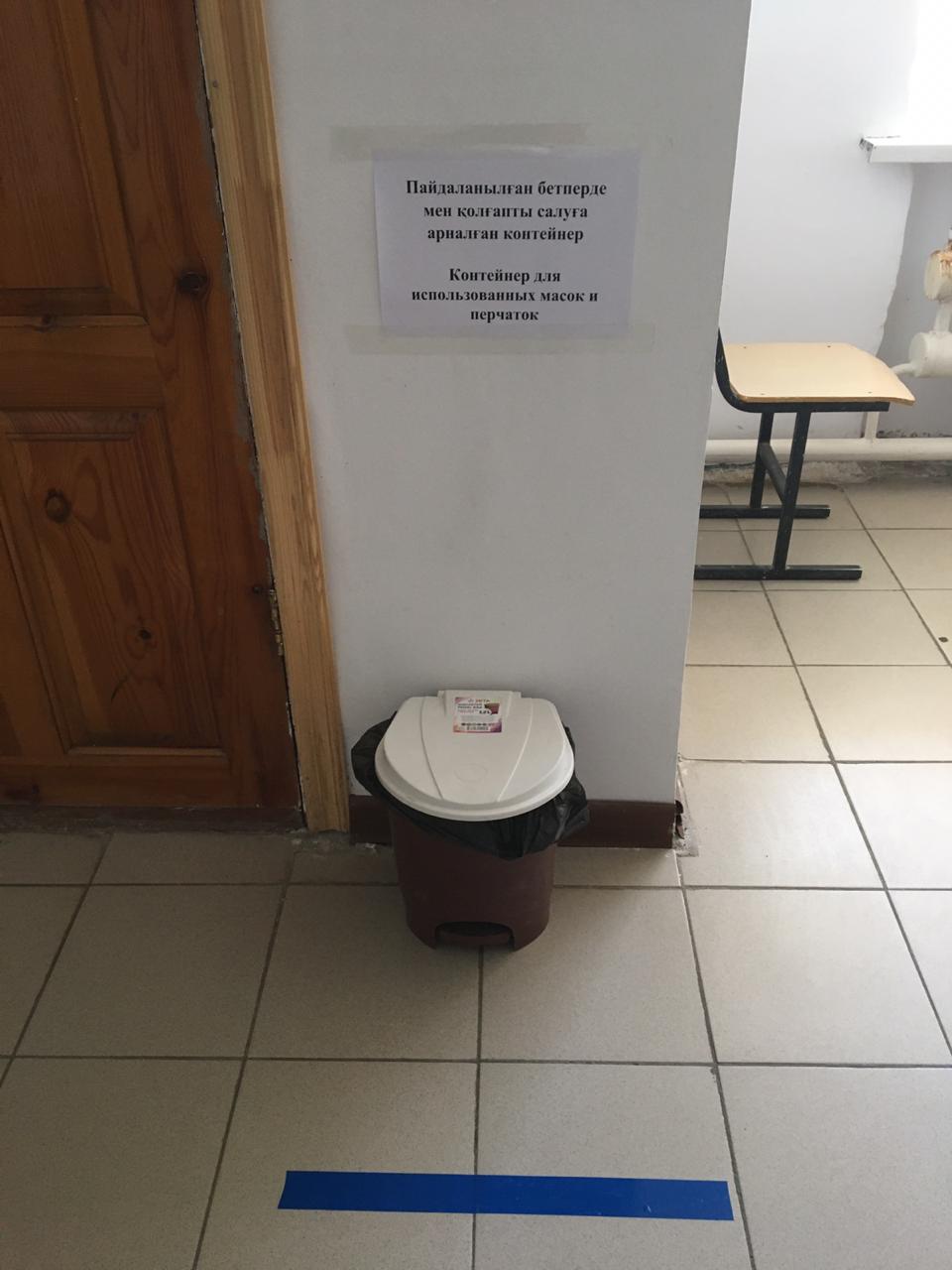 Оқу ғиаратының 1-қабаттарында қолданылған бетперде мен қолғаптарды лақтыруға арналған қоқыс салғыш (2), әжетханаларда қолды залалсыздандыруға арналған сабын және кептіруге арналған электронды тоқ кептіргіш (3) орнатылды.