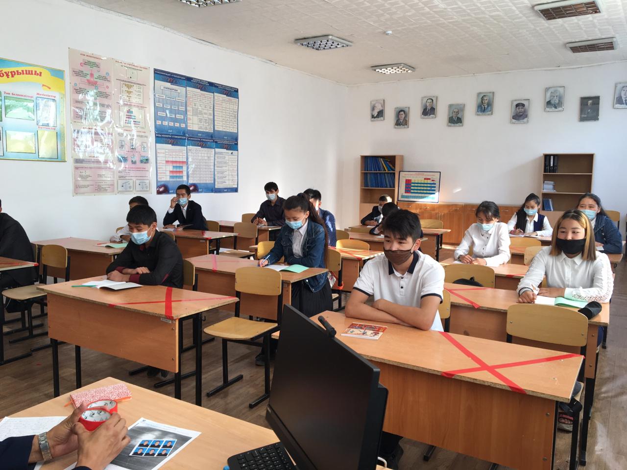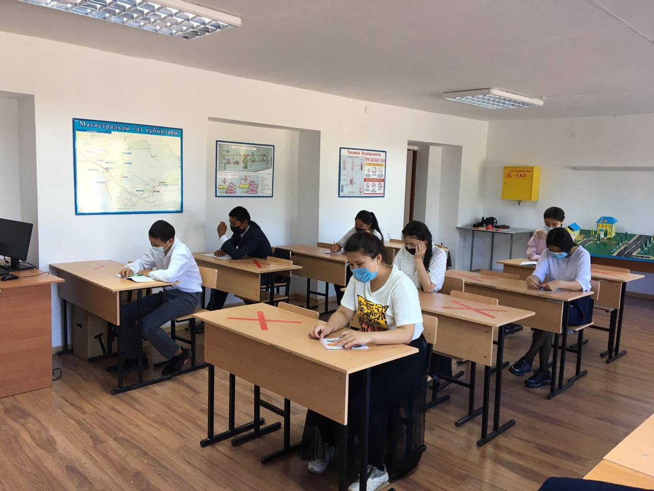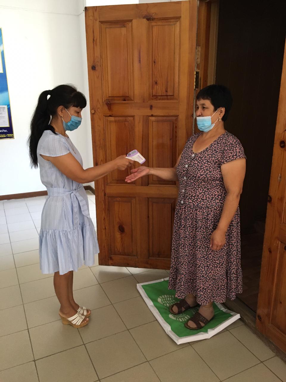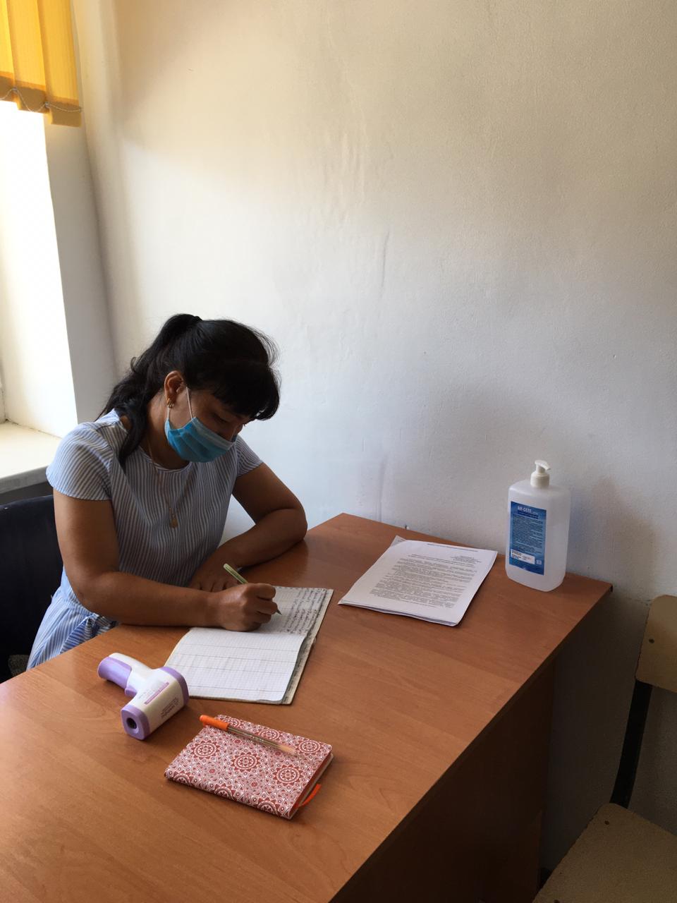 Колледжге кіре берісте кезекші студенттер, қызметкерлер және сырттан келушілердің қызуын арнайы құралмен тексеріп, тіркеп алады.
